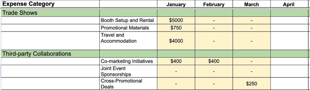 - Events and Trade Shows: Costs for booth setup, rental, promotional materials, and associated travel and accommodation for trade shows and other promotional events.