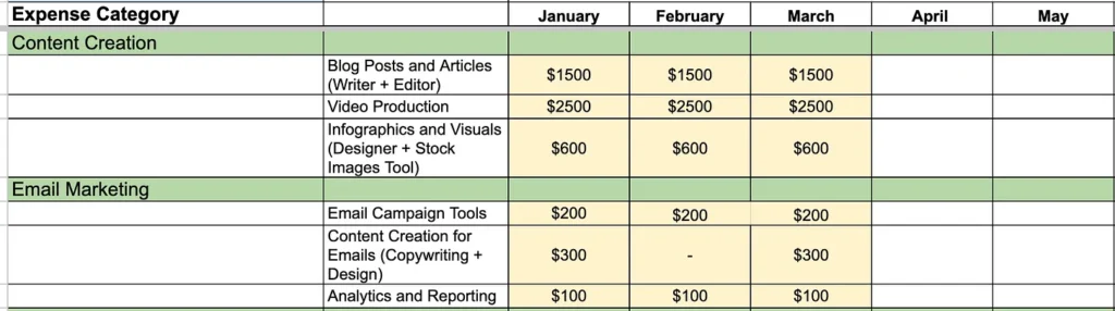 - Email Marketing: Budget for email campaign tools, content creation, and analytics.