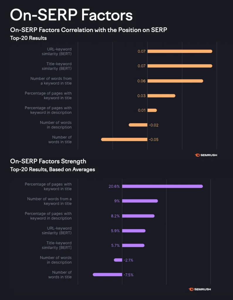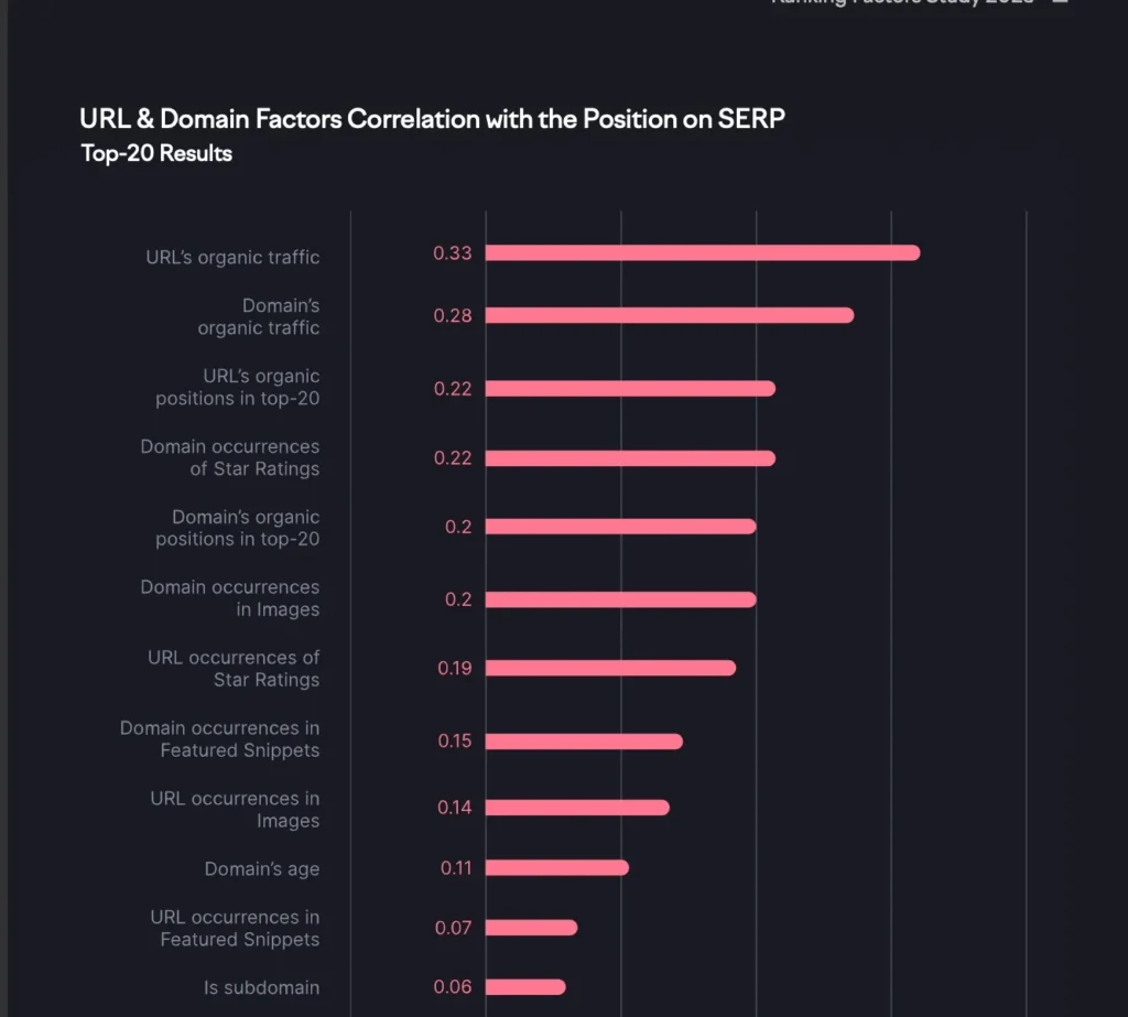 Any URL’s organic traffic, Domain’s organic traffic, and URL Listing in the top 20 correlate most to the SERP (Search Engine Results Page) factors.